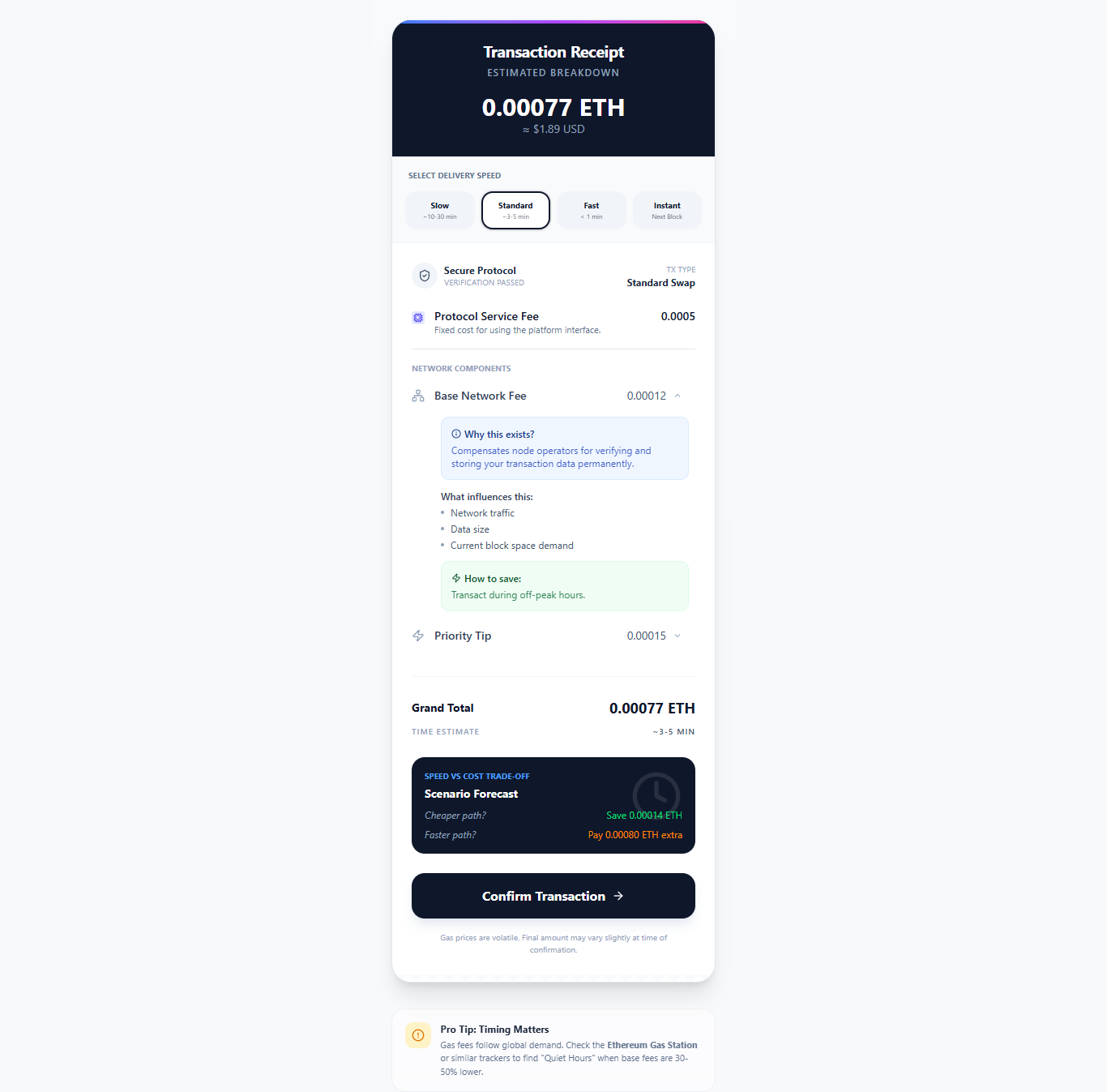 Break network and protocol fees into clear components. Show: