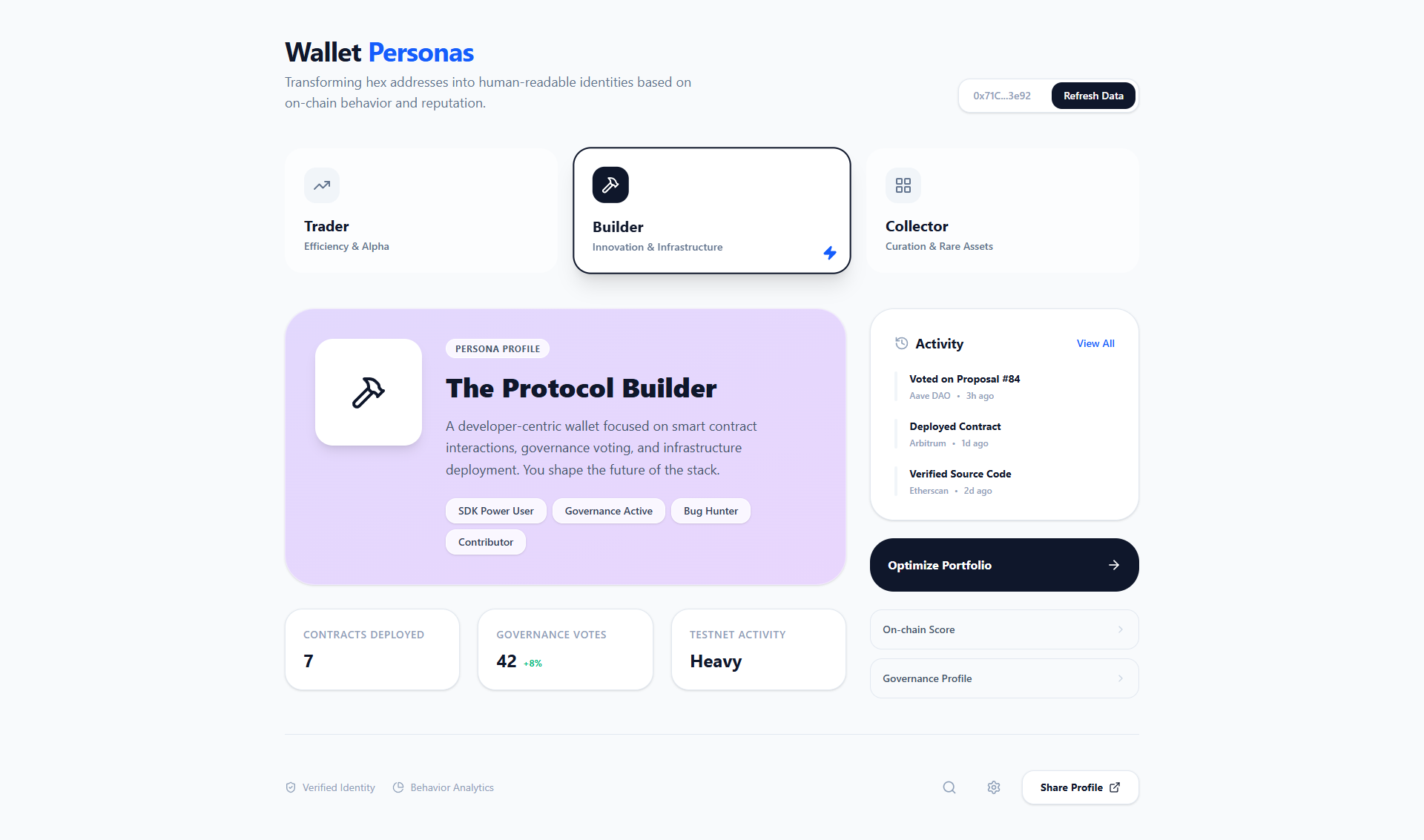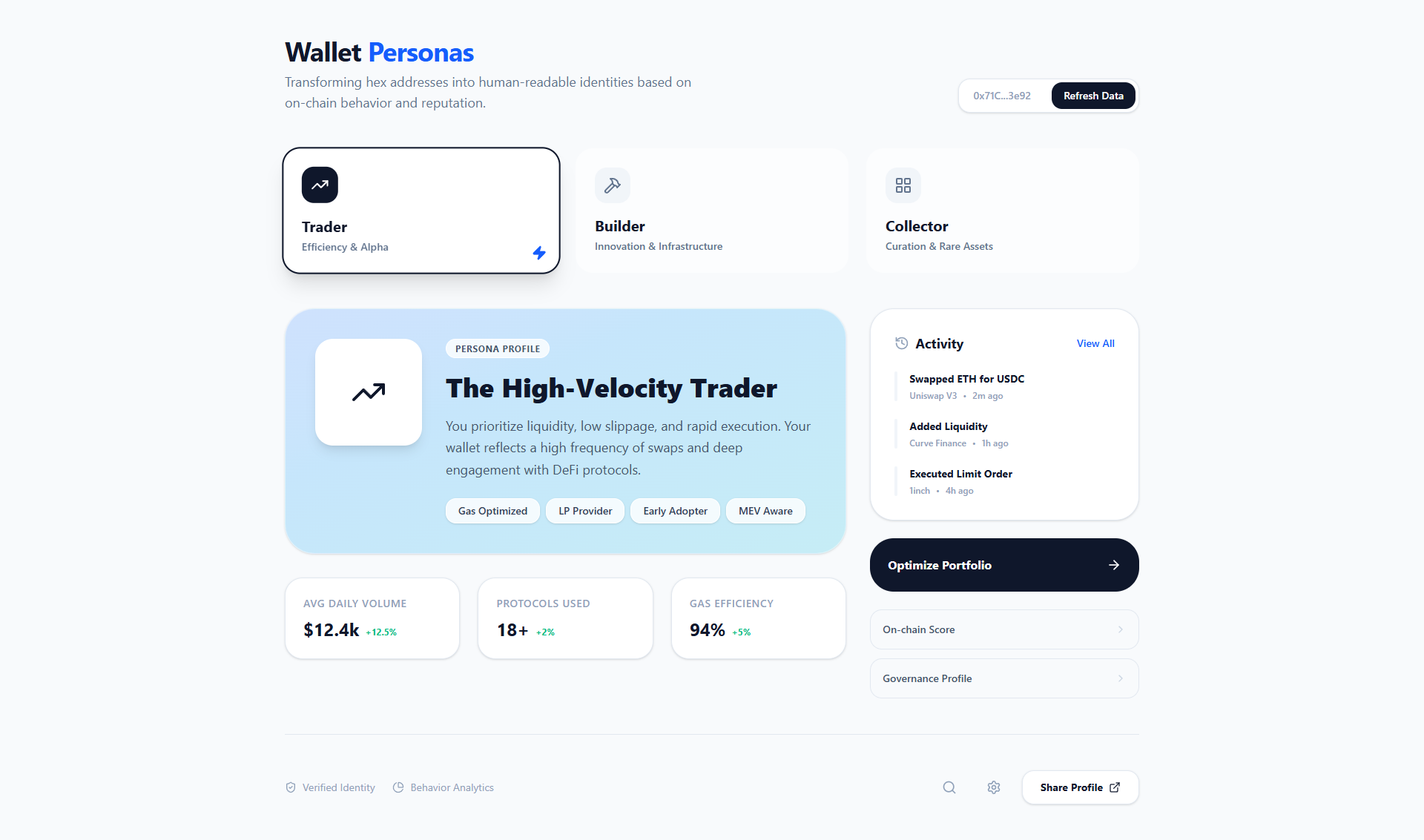 Transforming hex addresses into human-readable identities based on on-chain behavior and reputation.