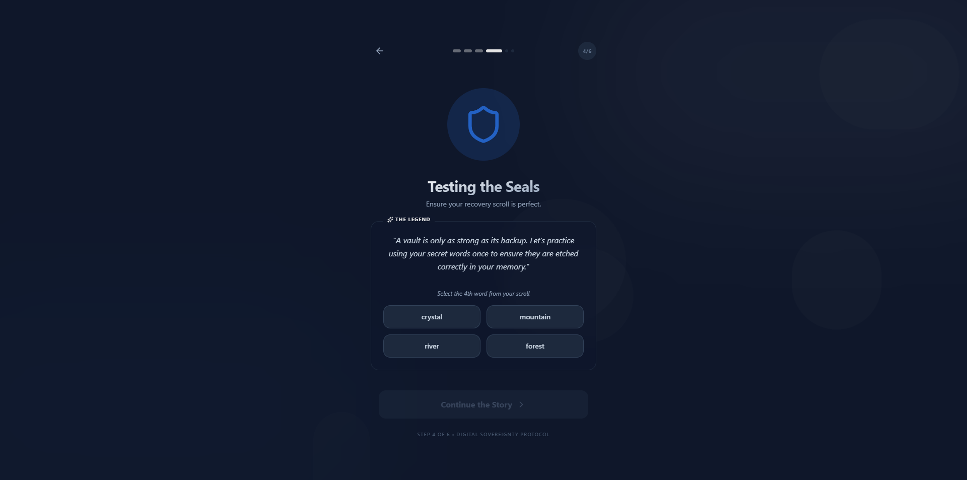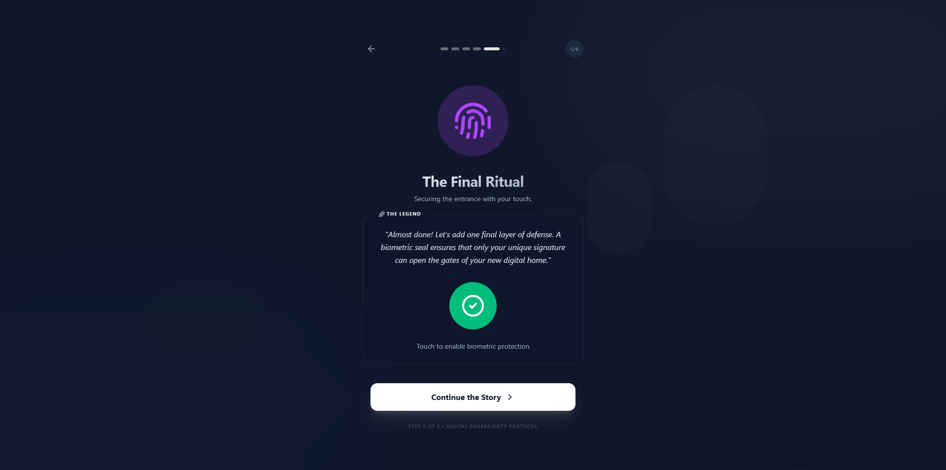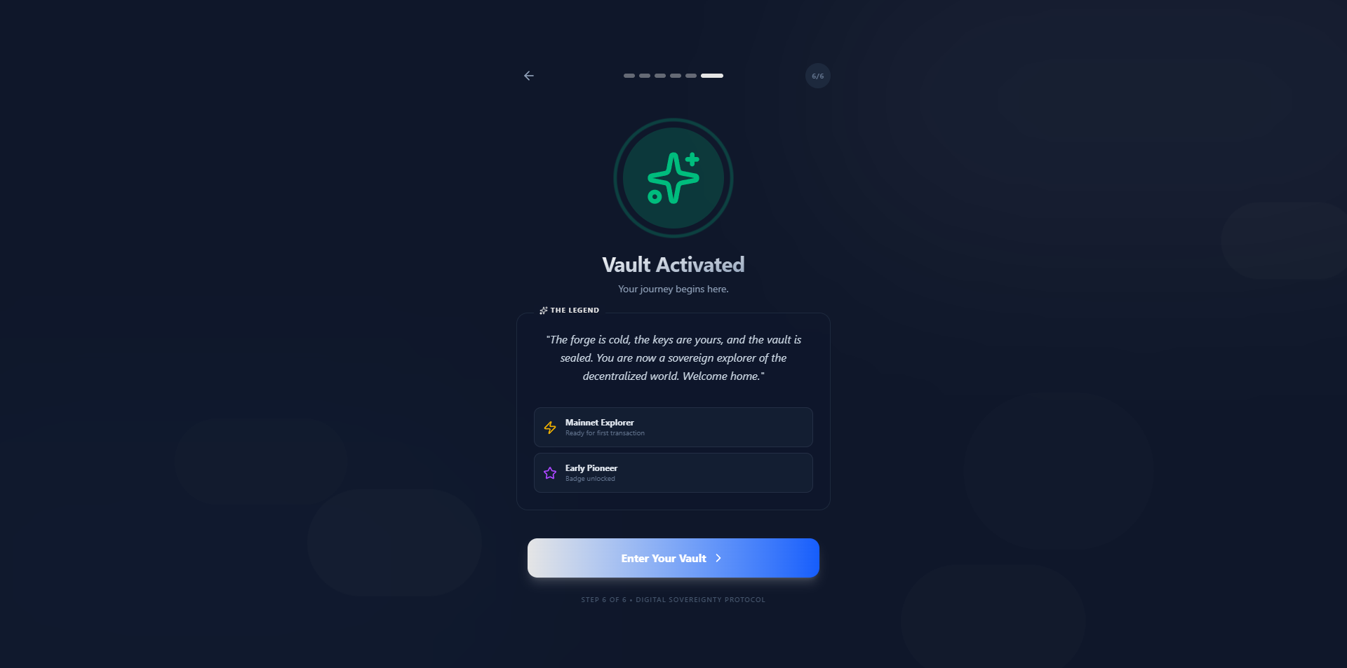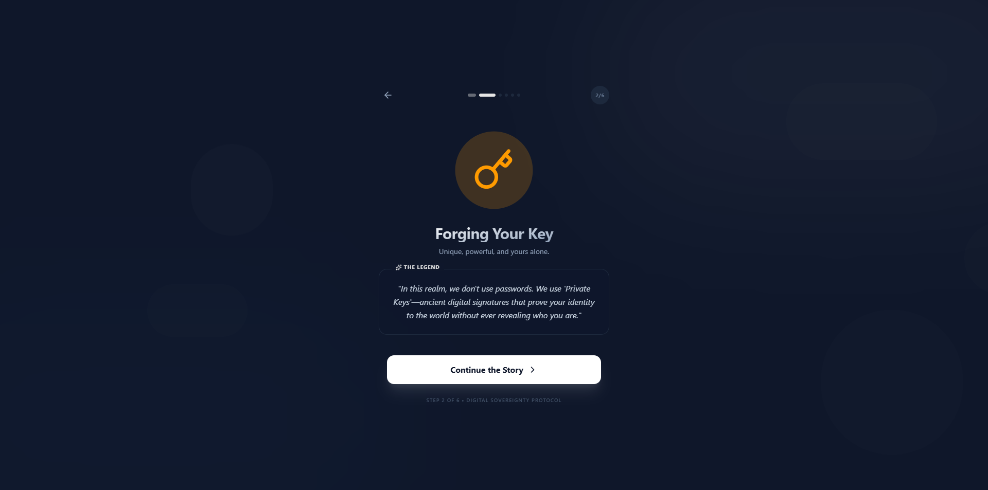 Step-by-step setup told like a story (“You’re creating your digital vault…”) instead of cold technical screens.